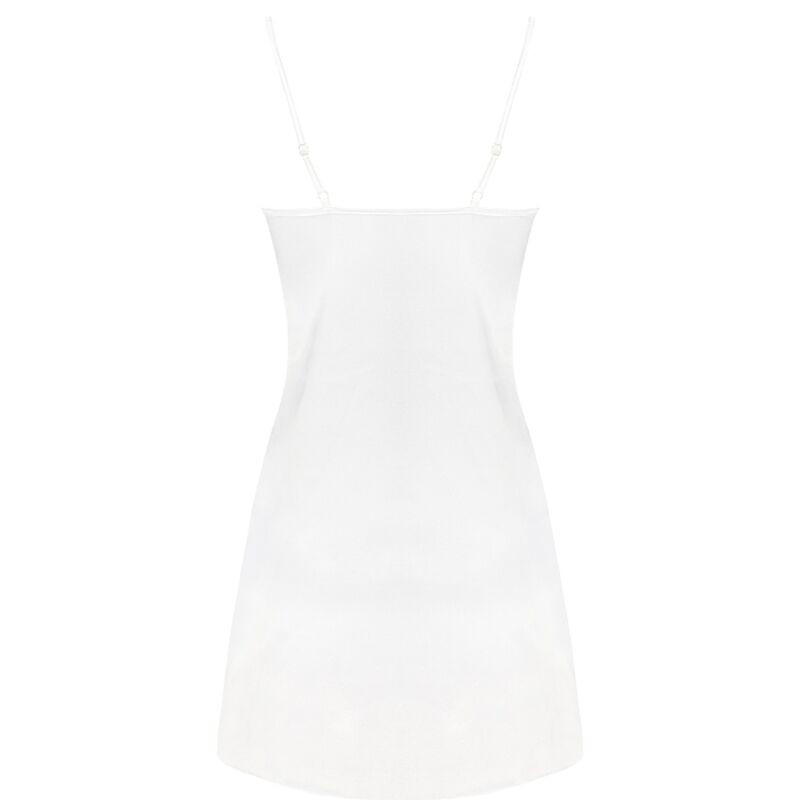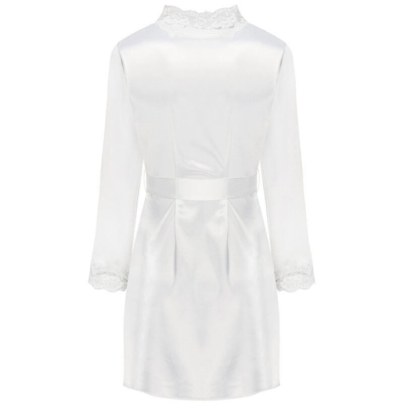 Un completo di biancheria intima di eccezionale bellezza, realizzato in raso ecrù lucido, un accappatoio con una camicia che arriva fino a metà coscia. La parte anteriore e le maniche lunghe della vestaglia legate in vita con una cintura sono decorate con un bellissimo pizzo. T-shirt con spalline sottili e regolabili, decorata con lo stesso pizzo sul busto. Perizoma incluso.