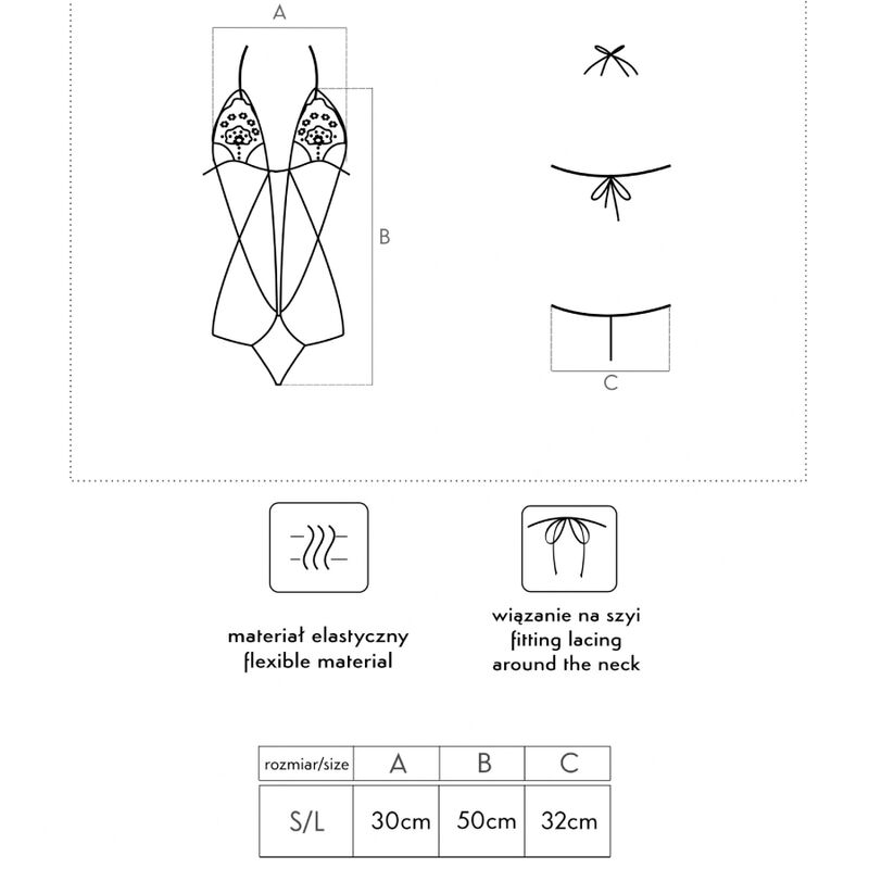 Un body minuscolo e sensuale accenderà la tua immaginazione e trasformerà la serata in un'esperienza indimenticabile. Il body Luisina è composto da un delicato reggiseno in pizzo e da un perizoma con un grazioso motivo a rose. Il perizoma e il reggiseno sono collegati da un groviglio di spalline che enfatizza la vita e le curve femminili. Un reggiseno che rivela parzialmente il seno sollevandolo leggermente aggiunge un tocco incredibile all'intero look. Le spalline sapientemente disposte che scendono tra i seni fino al perizoma stilizzano otticamente la figura. I fianchi e le spalle praticamente esposti, così come il perizoma, sono adornati da un bralette in pizzo. Come la schiena e i glutei, che sono decorati solo con una cinghia del perizoma e due cinghie, lo rendono una proposta audace per lei.