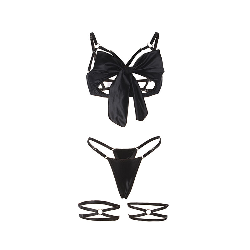 Il reggiseno ha coppe aperte che esaltano delicatamente il seno, decorato con un fiocco nero civettuolo che aggiunge un'aria giocosa e seducente. Realizzato in 95% poliestere e 5% spandex/elastan, offre una vestibilità comoda e flessibile che si adatta perfettamente alle curve del corpo, garantendo comfort e sostegno.