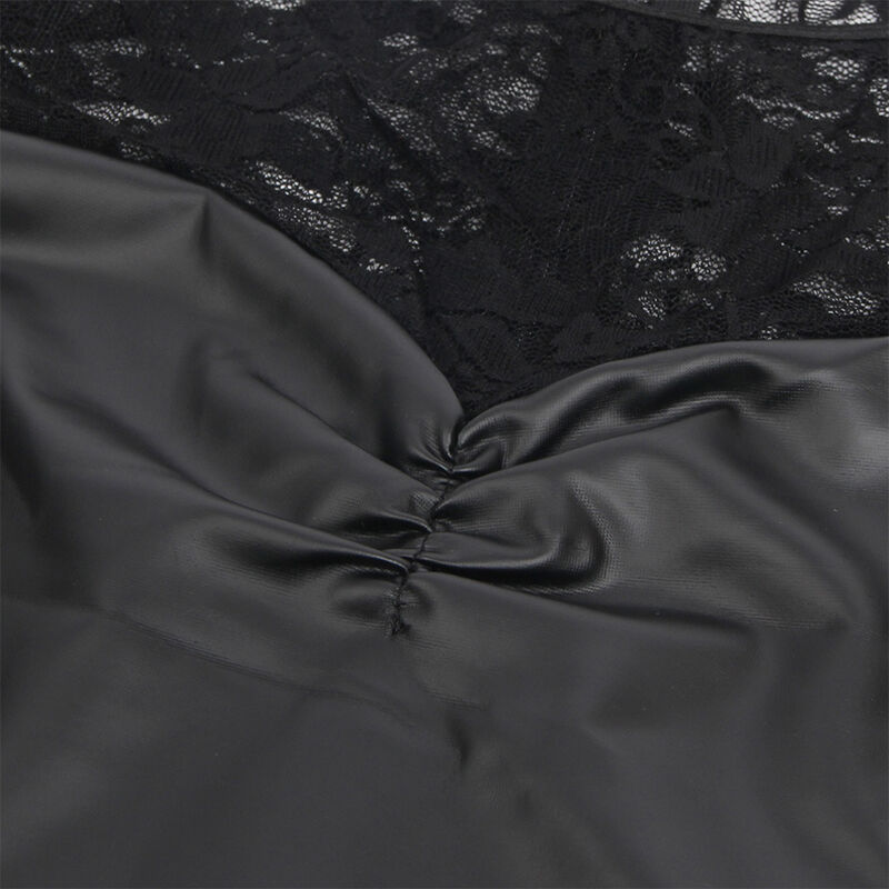 Realizzata in una miscela premium di 95% poliestere e 5% elastan/spandex, questa camicia da notte offre una consistenza morbida, elastica e confortevole che si adatta perfettamente al corpo. Le maniche lunghe aggiungono un tocco di raffinatezza, mentre i delicati dettagli in pizzo sul busto e lungo il bordo inferiore le conferiscono un'aria romantica e seducente. La finitura in pelle PU le conferisce una lucentezza elegante e audace, mentre la sua vestibilità elastica e lusinghiera evidenzia ogni curva in modo naturale.
